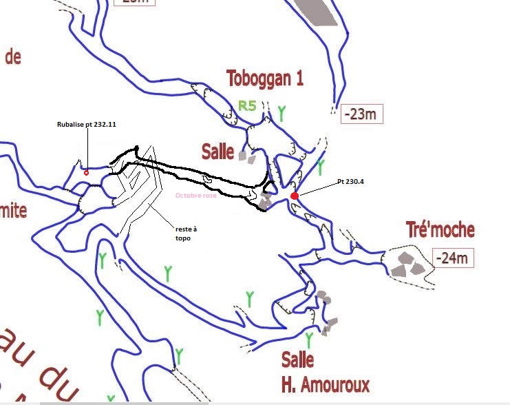 Il faudra reprendre la topo des galeries depuis le pt 230.4 jusqu’au rubalise de la marmite (pt 232.11) pour boucler la topo.